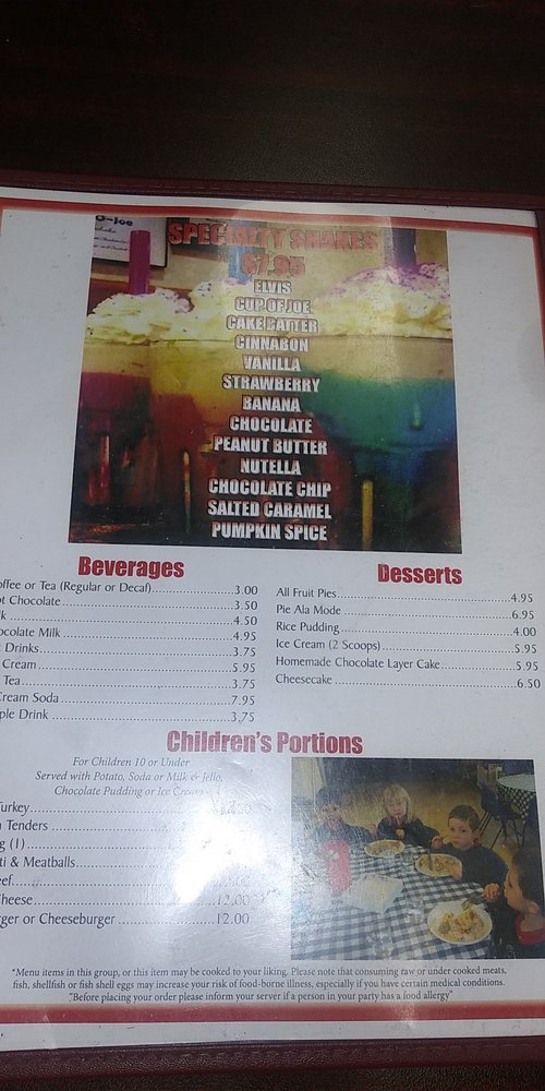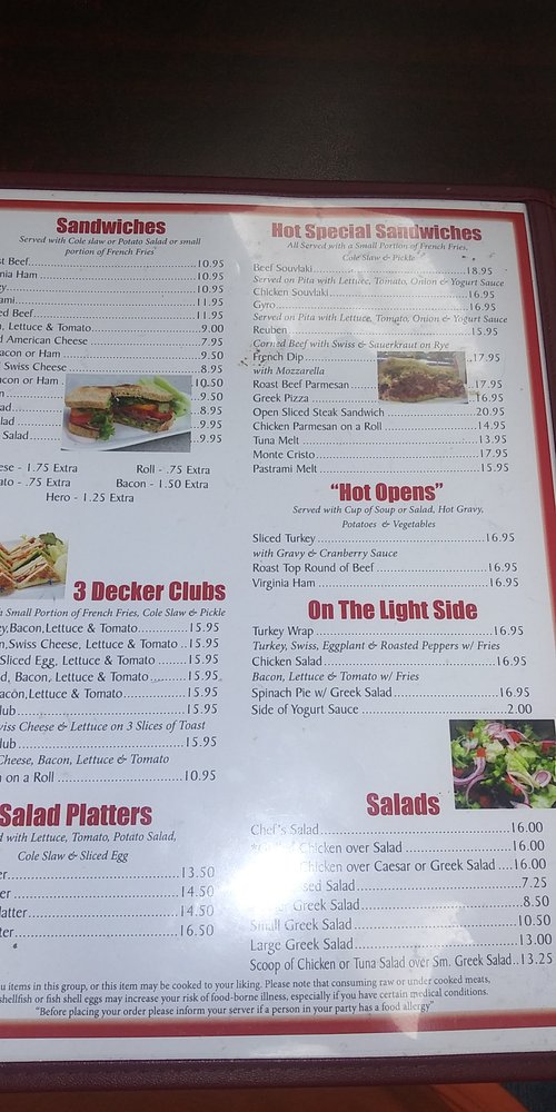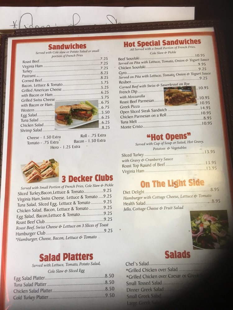 Eggs Breakfast Specials Breakfast Whiteboard Specials French Toast Or Pancakes Waffles Omelettes Breakfast Side Orders Bakery Juices & Drinks Cereals Sandwiches 3 Decker Clubs Salad Platters Hot Special Sandwiches Hot Opens On The Light Side Salads Burgers Soups Appetizers Side Orders Dinner Entrees Seafood Entrees Evening Specials Shakes Desserts Children Menu