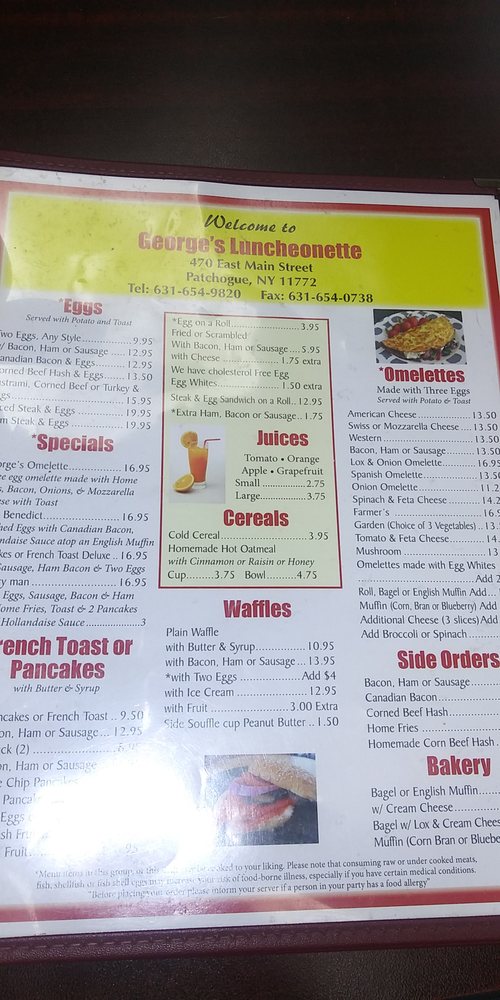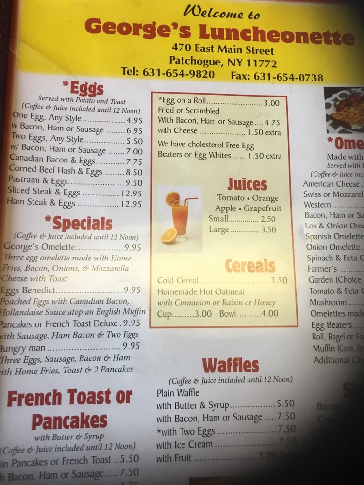 George's Luncheonette, nestled in Patchogue, NY, offers a delightful New American cuisine. The menu boasts a variety of breakfast options, from classic two eggs any style to decadent breakfast specials like Eggs Benedict and George's Omelette. Customers rave about the friendly and attentive staff, affordable prices, and generous portions. The cozy ambiance and clean environment make for a pleasant dining experience. With options for takeout, reservations, and waiter service, George's provides a versatile dining experience. Whether you're craving a hearty breakfast or a casual brunch, George's Luncheonette is a must-visit spot for delicious home-style cooking in a welcoming atmosphere.